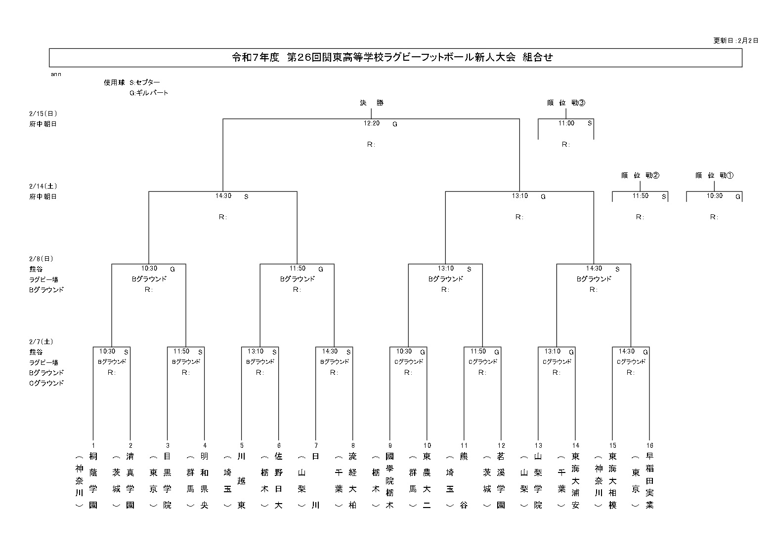2月2日 令和7年度 関東高校新人ラグビー大会 組合せを掲載しました
